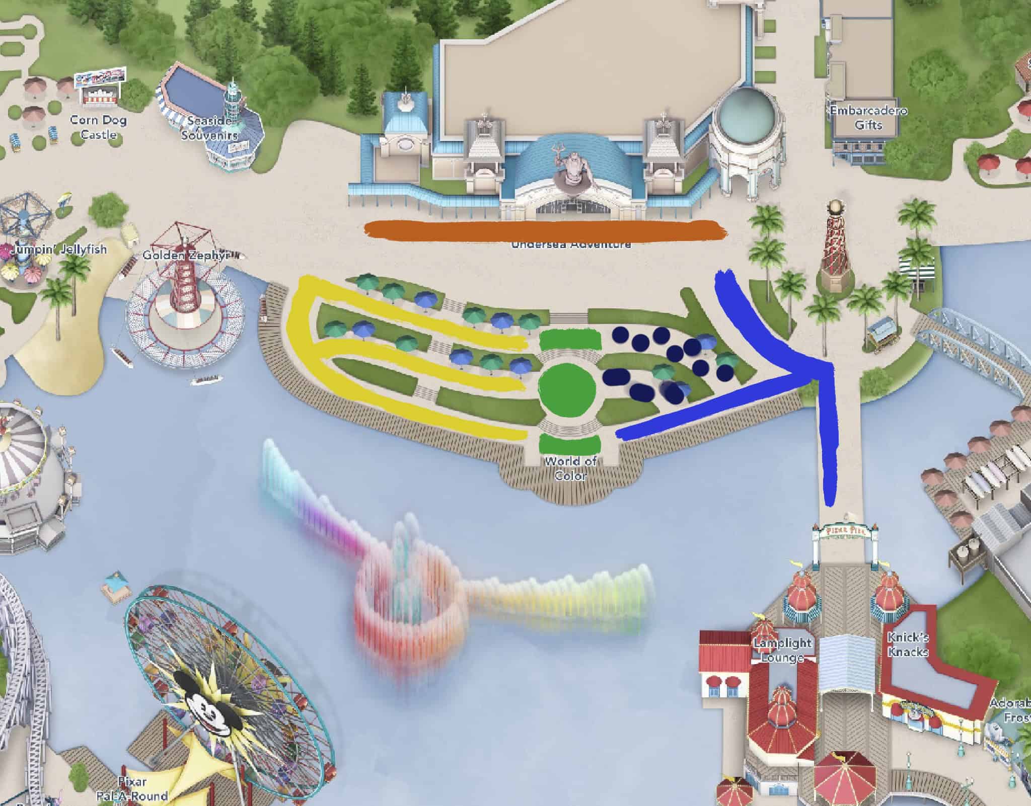 Now lets talk locations! This map shows the viewing options for viewing the water show, most are standing room only and you can expect to get misted in all viewing areas and more so in the front rows of each section. So lets break it down…